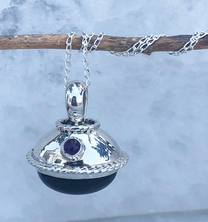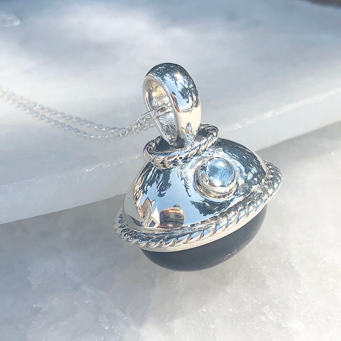 A gorgeous Necklace Pendants. This Jem features a full half sphere Obsidian, with 2 Satellites, one Obsidian the other Quartz. Obsidian is rapidly cooled lava, an ideal contrast to bright Sterling Silver, because of its dark black appearance. It is an intensely protective stone that forms a shield against negativity. This Pendant is heavy and feels great. It demands attention.