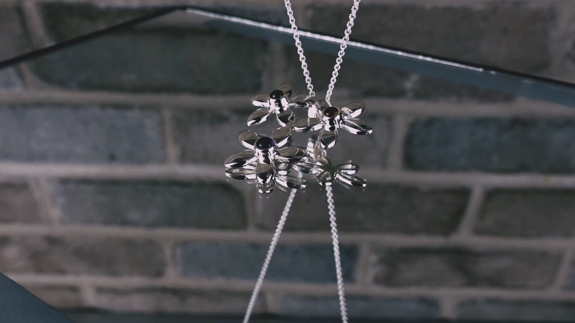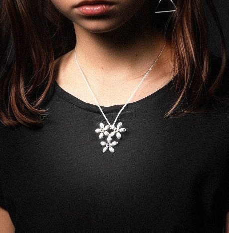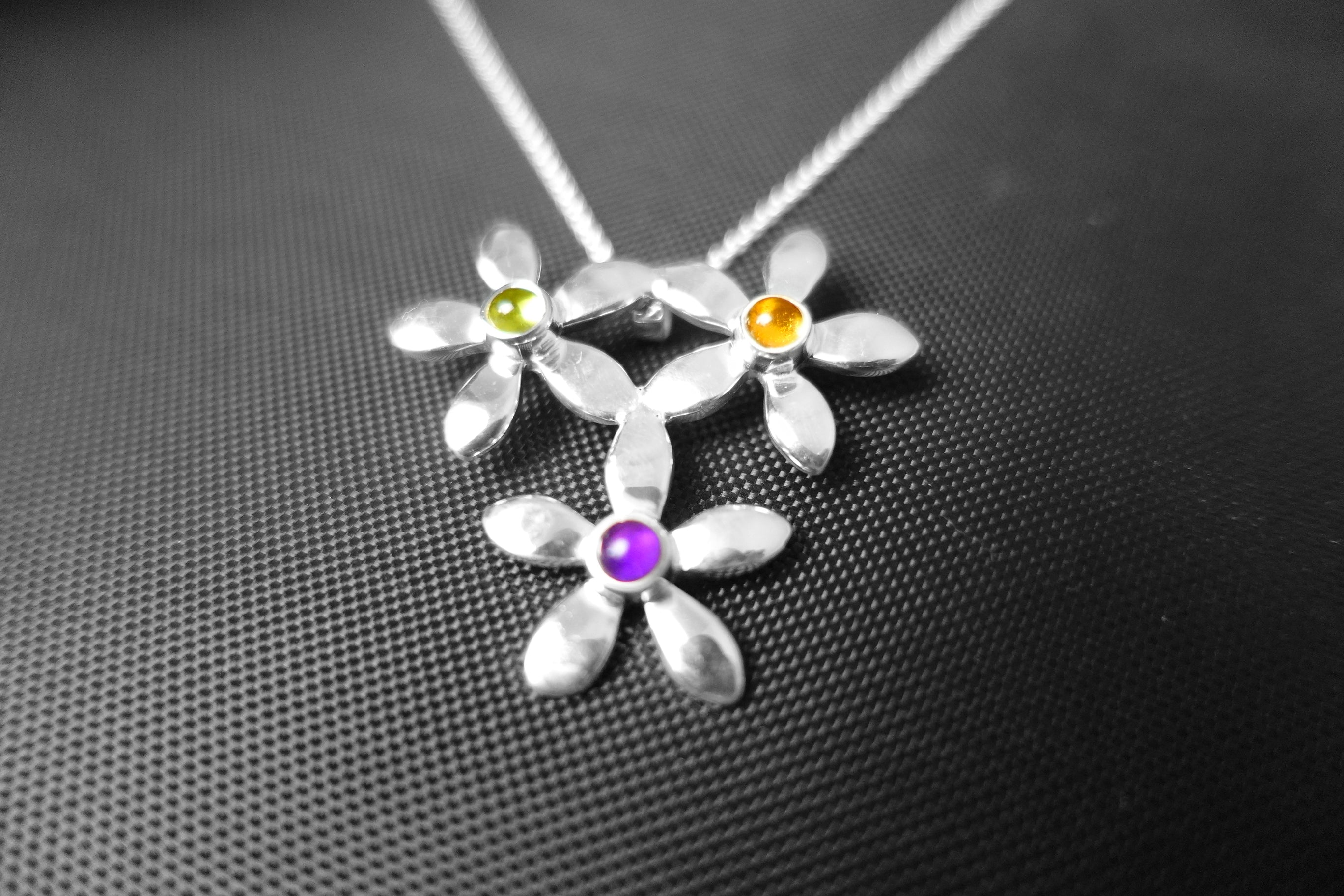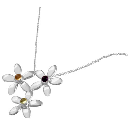 Handcrafted 925 Sterling Silver Triple Flower Pendant Necklace with 3 Gemstones.